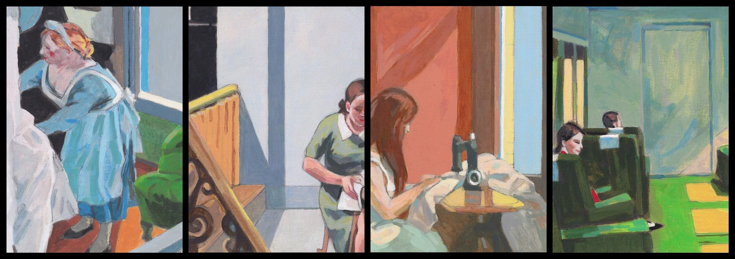 Here are four small studies I just completed, each of them cropped from an Edward Hopper painting. Doing them accomplished two things: first, I was back in the studio, finding my eyes, in a way that close studies have accomplished the same for me in the past, and second, I explored a master colorist’s schemes in a way that calibrated my own. These are translations, or studies, more than they are copies.